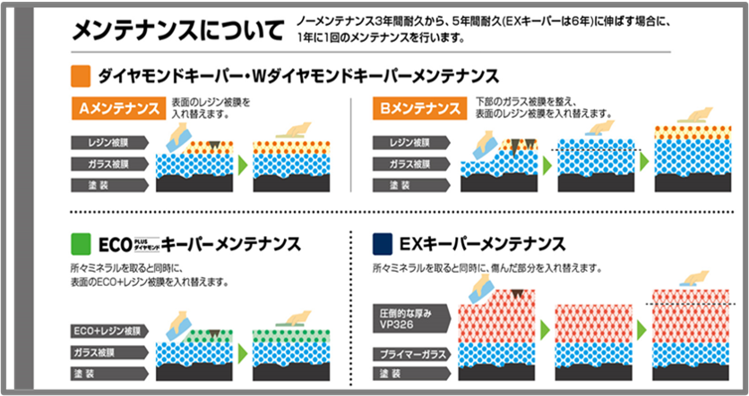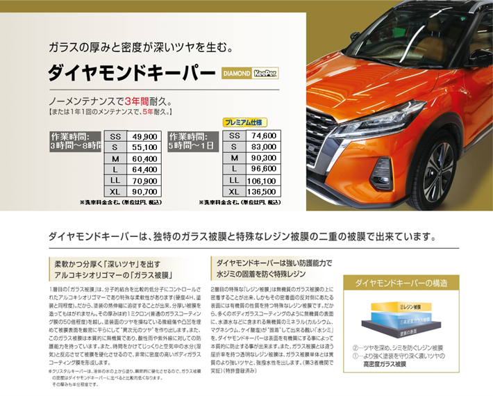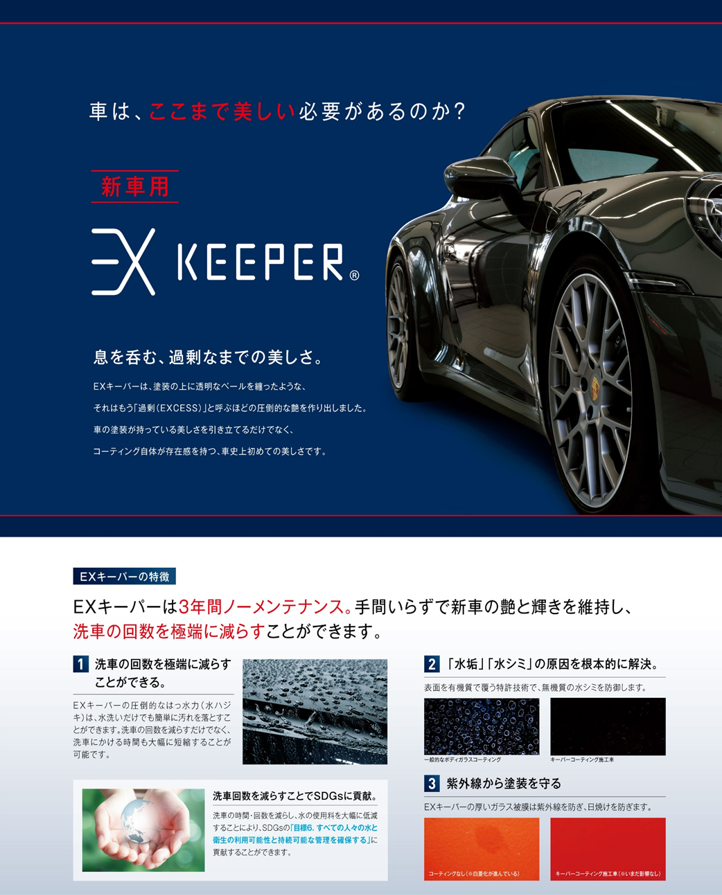 キーパーコーティングは、「塗装面改善の理論」に基づき、愛車の美的ケアの理想を実現するための専用ケミカル群・機器と独特の施工技術で構成されるシステムの総称です。また、クルマの塗装そのものが持っている本質的な輝きを引き出しクルマの価値そのものを保つコーティングです。