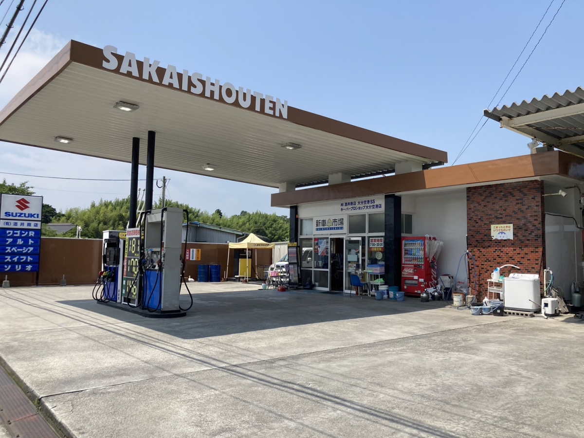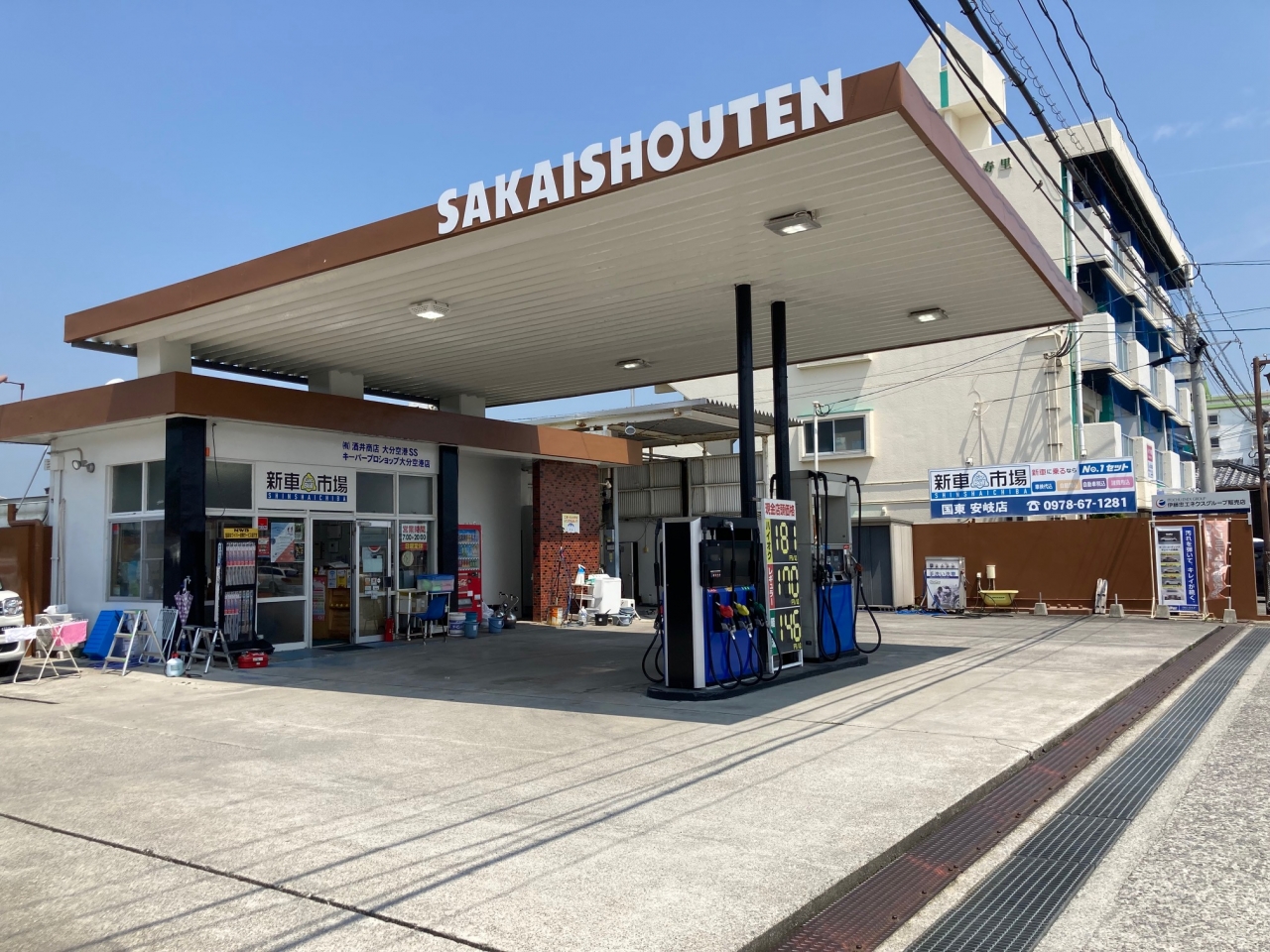 セブンイレブン前のキーパーブルーカラーのガソリンスタンドです。杵築市方面からお越しの際は、この景観を目印にご来店ください。