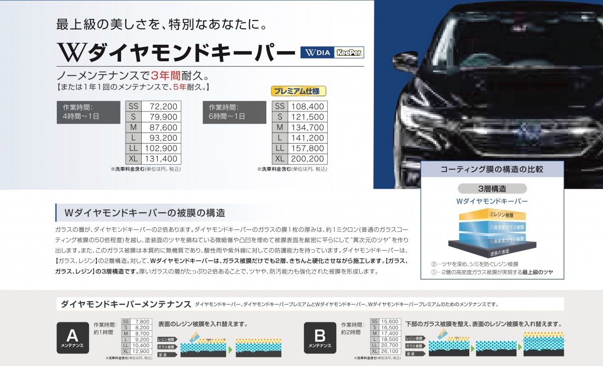 「ダイヤモンドキーパーと同等のツヤ」「EXキーパーと同等の自浄効果(自然の雨で汚れが落ちる効果)」「Wダイヤモンドキーパーと同価格」という3つの特徴を有している。