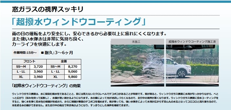 ※当店では、窓ガラスへの撥水コーティングの前に油膜取りをしっかりと行います。 その為、洗車時にお申し付けください!