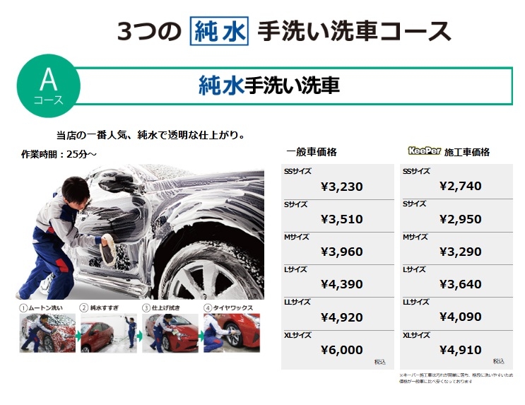 まれにある「シャンプー洗車禁止のコーティング車」にでも、 (新車時のコーティングに、まれにあります。)「ムース手洗い洗車」なら、安心してお任せいただけます。 さらに、最後の仕上げで使用する「純水」は、 今までの洗車とは別次元のピュアな仕上がりを実現しています。