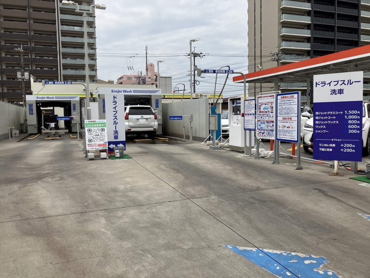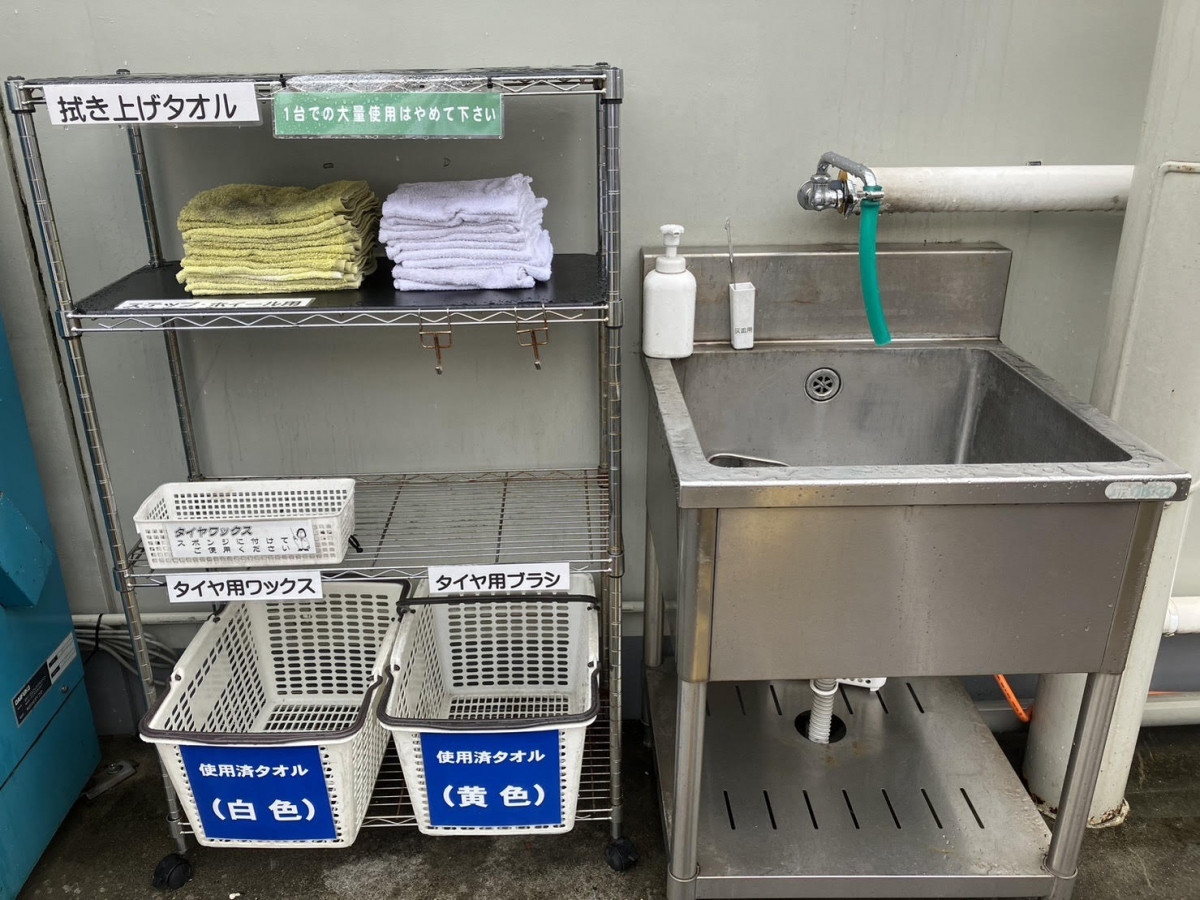 洗車機に入る前にボディーを洗う予備洗い用ブラシやモップ、洗車完了後の拭き上げ用タオルの