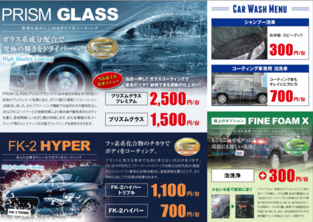 当店は、機械・手洗い洗車から、プロの仕上げるコーティングまで幅広いメニューをご用意しております。