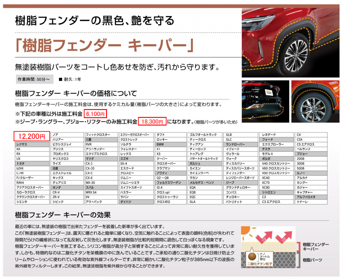 ▼樹脂部分に施す特殊なコーティングです。 フェンダー部分やワイパー付近の白ボケした樹脂部分が蘇ります。 白ボケしていない車にも予防になります!