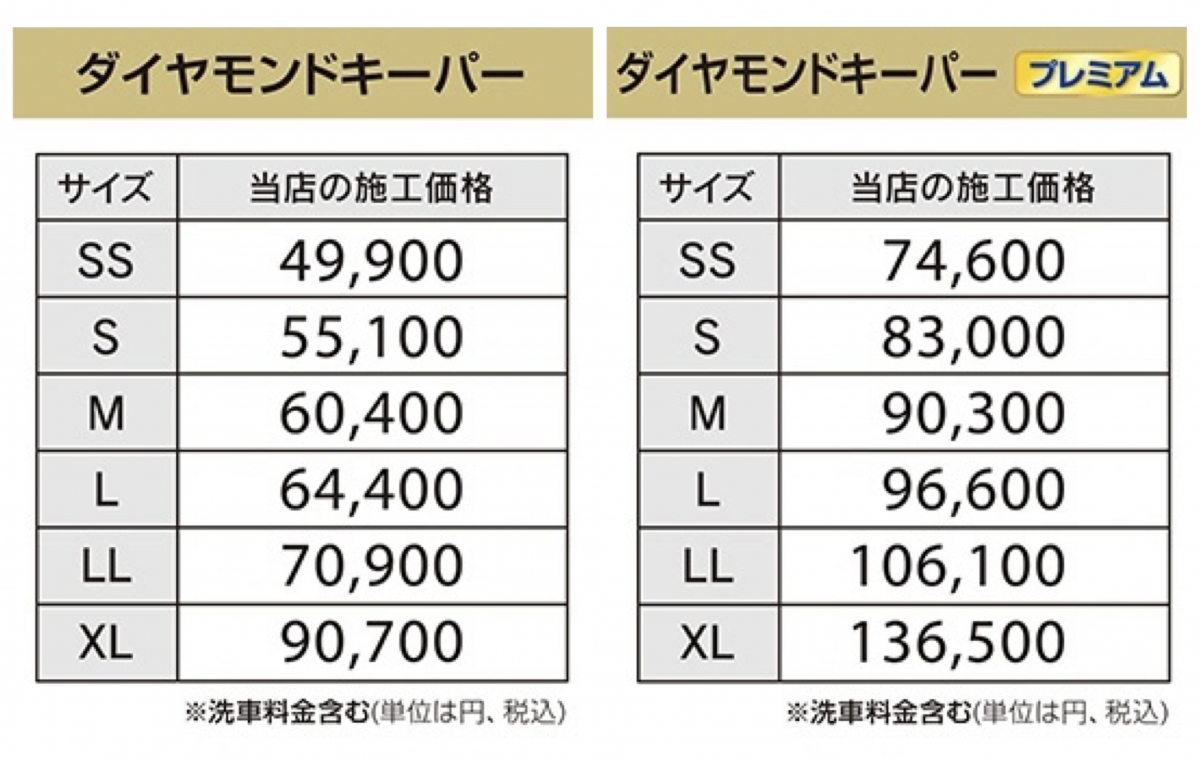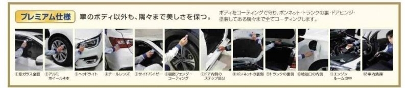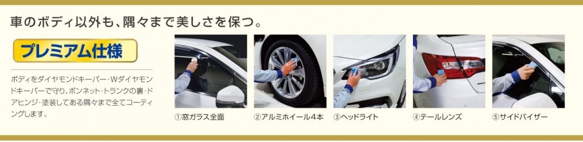 ●プレミアムメニューでのプラス部位はダイヤモンドキーパー、Wダイヤモンドキーパー、ECOプラスダイヤモンドキーパー全て共通で「①窓ガラス全面②ホイール4本③ヘッドライト④テールレンズ⑤サイドバイザー⑥樹脂フェンダーキーパー⑦ステップ部分⑧ボンネット裏⑨トランク裏⑩給油口内側⑪エンジンルーム⑫車内清掃」の全12点になります。