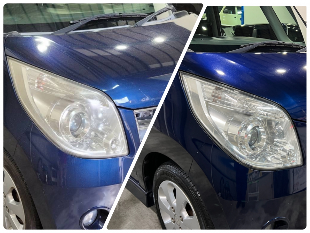 施行前は塗装面が白くボヤけてヘッドライトも曇っていますが、施工後は青々と光を放っています!