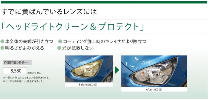 ヘッドライトクリーン&プロテクトは経年劣化により黄色く変色したり曇り等が発生したヘッドライトの劣化を除去し
