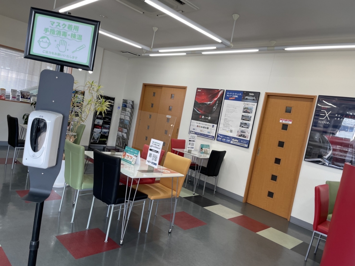 広い室内には感染対策の消毒、各座席にはアクリルボードの設置、手洗いブース・デモカーブースがご覧いただけます。