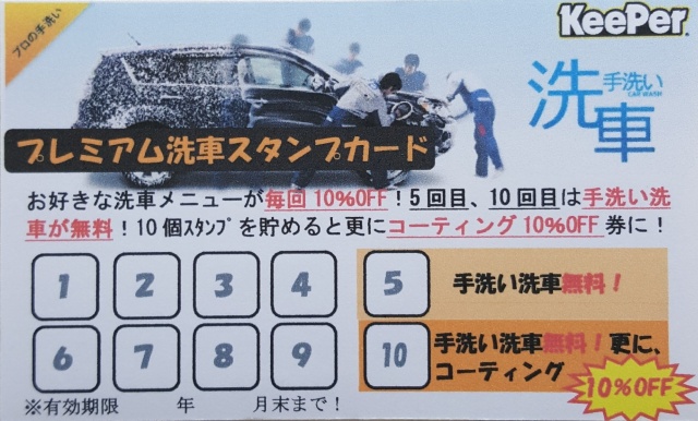 ?更に、お得な特典として洗車スタンプカードを発行しています。洗車1回につき1つスタンプを押印!スタンプを貯めると5回目と10回目の洗車が無料に!しかも、当店でコーティング(クリスタルキーパー、ダイヤモンドキーパー、ダブルダイヤキーパー)をしていただいた方には更に洗車をお得にしていただくために、プレミアム洗車スタンプカードを発行しています。こちらは洗車無料特典の他に毎回洗車が10%OFFになります!少しでも安く、綺麗に乗っていただけたらと思っていますので、スタンプカードを有効活用していただけたら嬉しいですね。