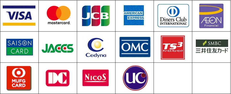 JCB, Master Card, VISA, NICOS, DC, UC, UFJ, Orico, 楽天, JACCS,セゾン,イオン,