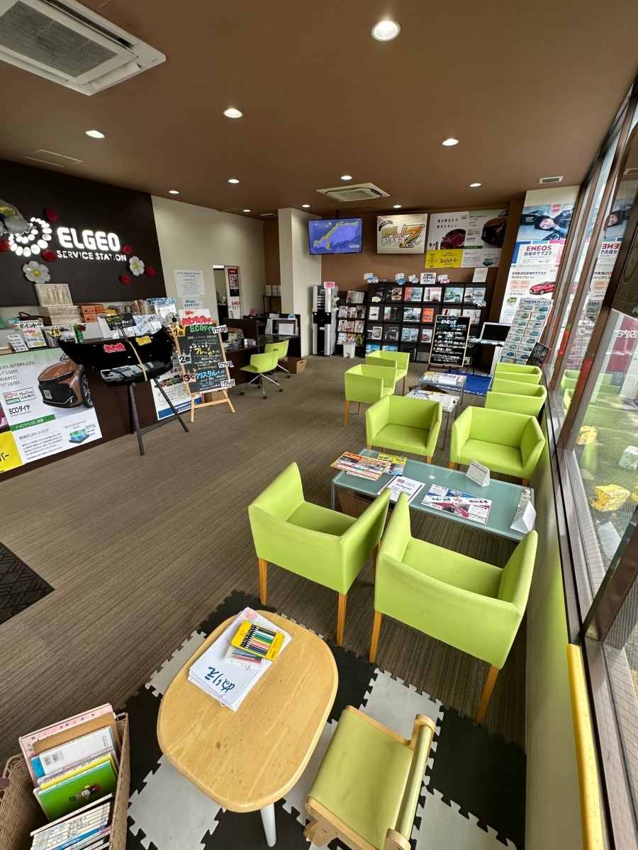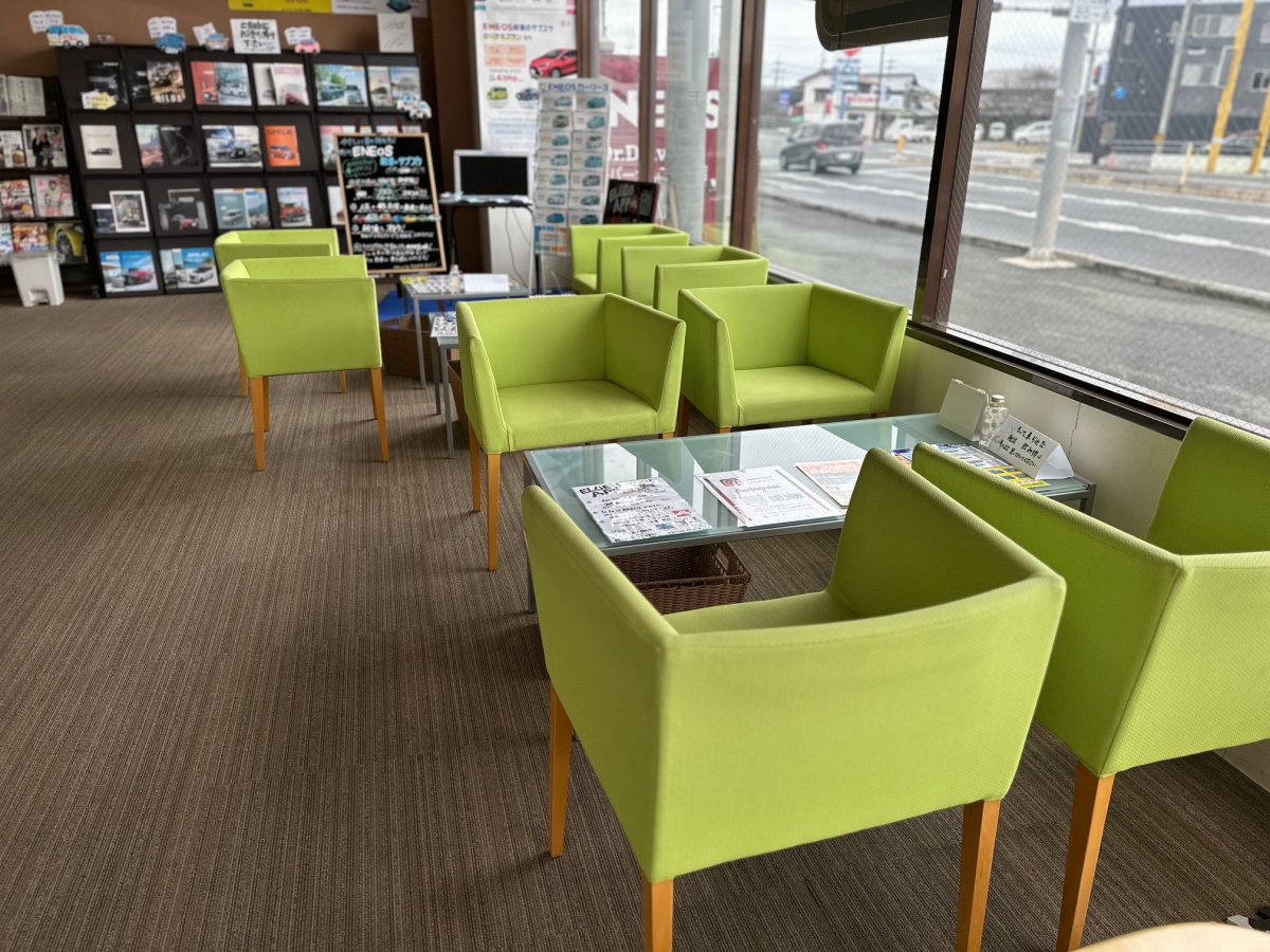 アットホームな店内です。 くつろげるように雑誌や、お車のカタログ等も置いています♪ キッズルームもあるので、小さなお子様も安心できます♪
