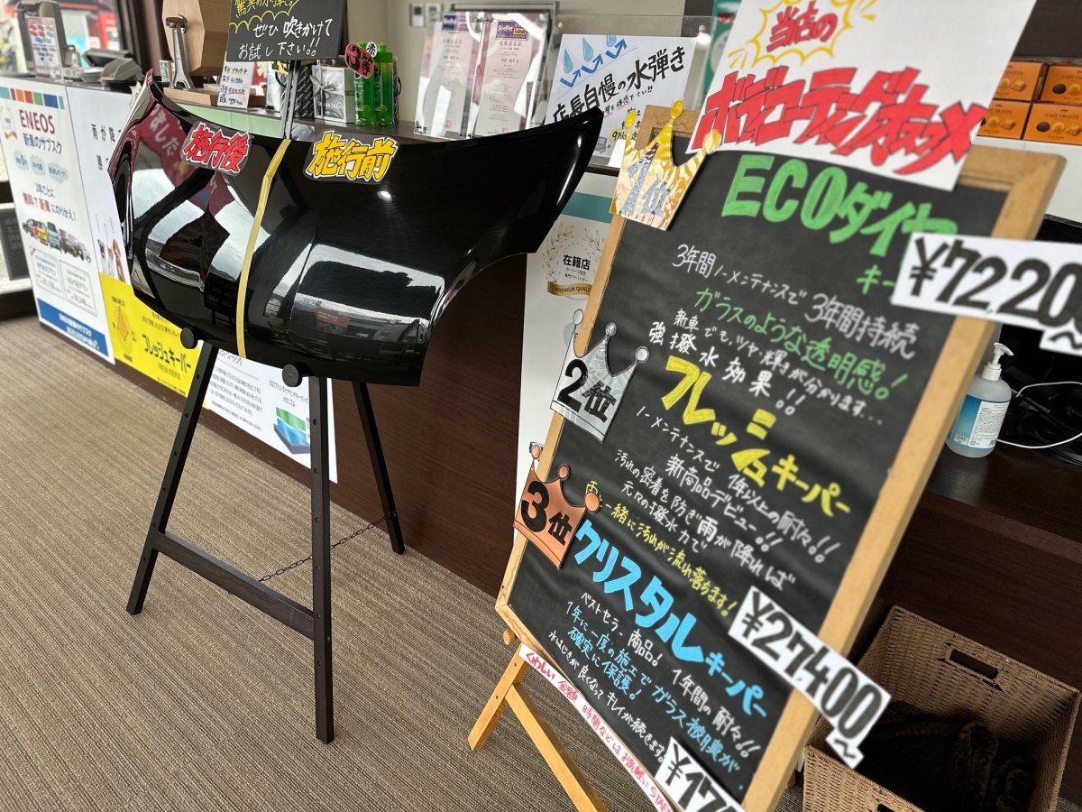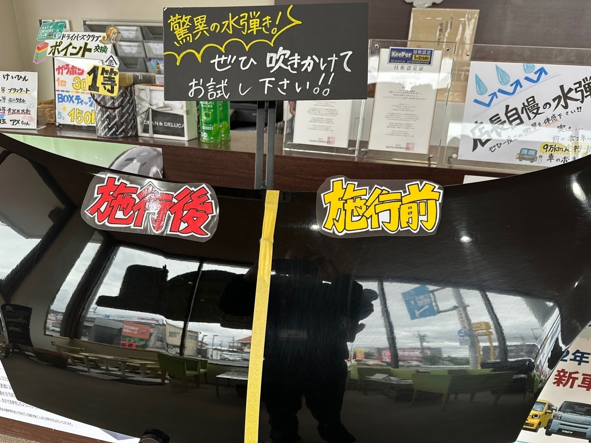 コーティング施工前・施工後と比較できるように店内にボンネットを配置しています♪