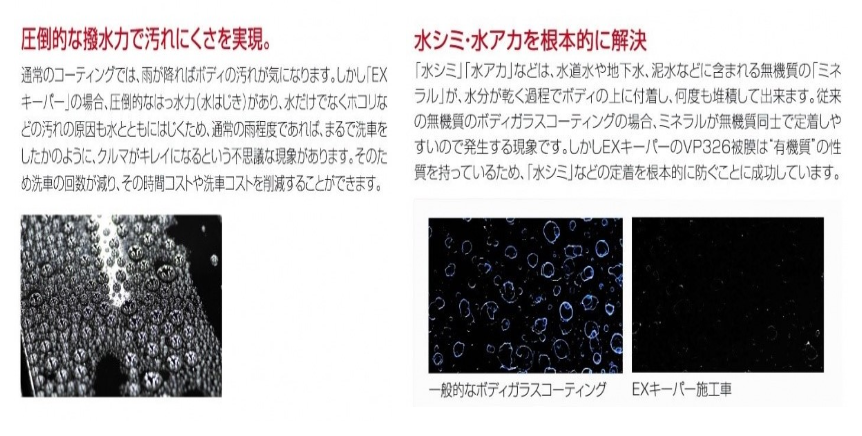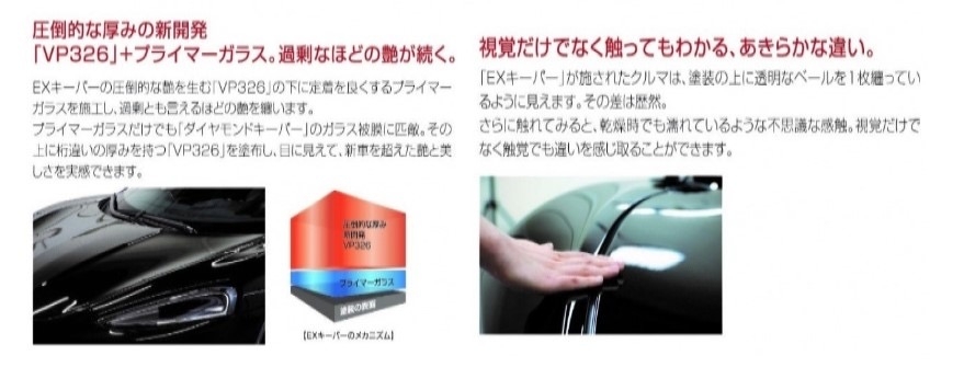 今までのコーティングでも充分な艶を出すことができますが,EXキーパーは塗装の上に透明なベールを纏ったようなそれはもう(過剰EXCESS)と呼ぶほどの圧倒的な艶を作り出しました。 車の塗装が持っている美しを引き立てるだけでなく、コーティング自体が存在感を持つ 車史上初めての美しさです。