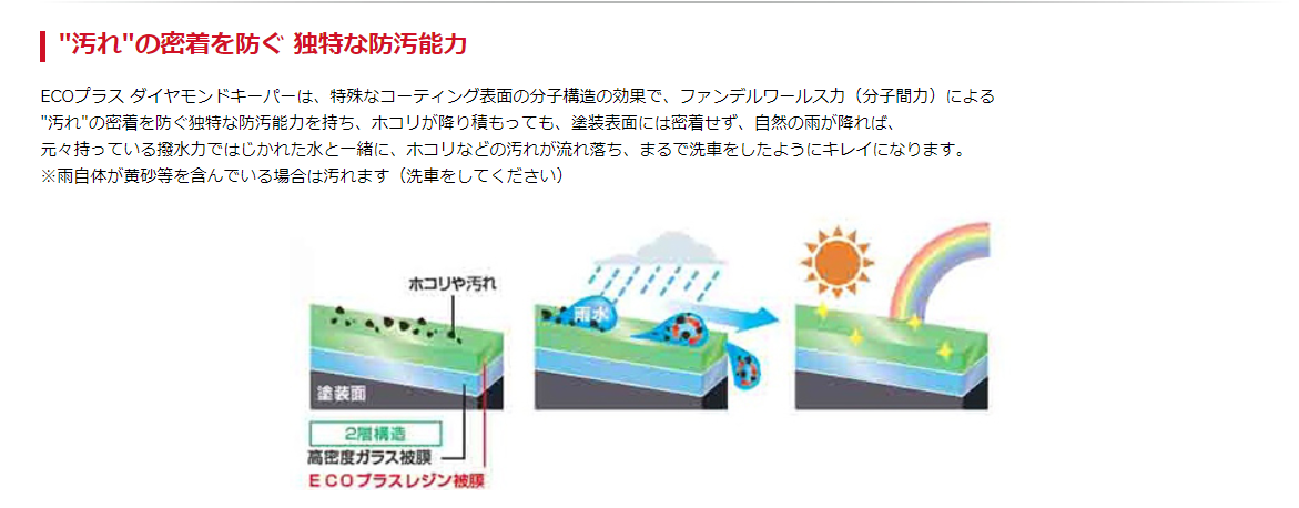 ☆1層目が高密度ガラス被膜でより強く塗装を守り深く濃いツヤを出す ☆2層目のレジン被膜が身代わりとなり外部の汚れ(攻撃)を受け止める!!! <特徴1層目のガラス被膜は厚みが約1ミクロン(普通のガラスコーティング膜の50倍程度)⇒微細傷や凸凹を埋めて被膜表面を厳密に平らにして”異次元の ツヤ”を作り出す!! 2層目のレジン被膜は無機質と有機質を持つ特殊なレジン被膜⇒水道水などに含まれる無機質のミネラル(カルシウム、マグネシウム、ケイ塩酸等)”固着”してできる醜い「水シミ」をダイヤモンドキーパーは表面を有機質にすることにより本質的に防止することができ、強いツヤと、強撥水性を 出します!!!