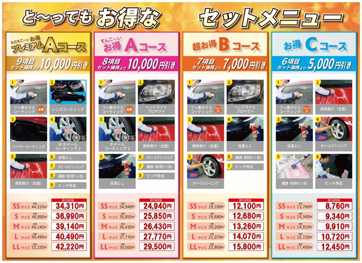 コーティングはボディだけじゃありません!窓ガラスコーティングやホイールコーティング等も施工出来るんです!ご予算に応じたお得なセットメニューを取り揃えていますのでボディコーティングにプラスして愛車をグレードアップさせちゃいましょう!
