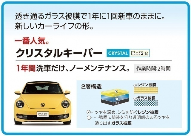 クリスタルキーパーの被膜は塗装の身代わりとなって、外部の攻撃を受け止め塗装を守ります。だから1年に1度、その表面の被膜を入れ替える必要があります。そうすることでいつもフレッシュな被膜がツヤを強調しながら、塗装を強力に守り続けることができます。これが、年に1回クリスタルキーパー施工をおすすめする理由です。