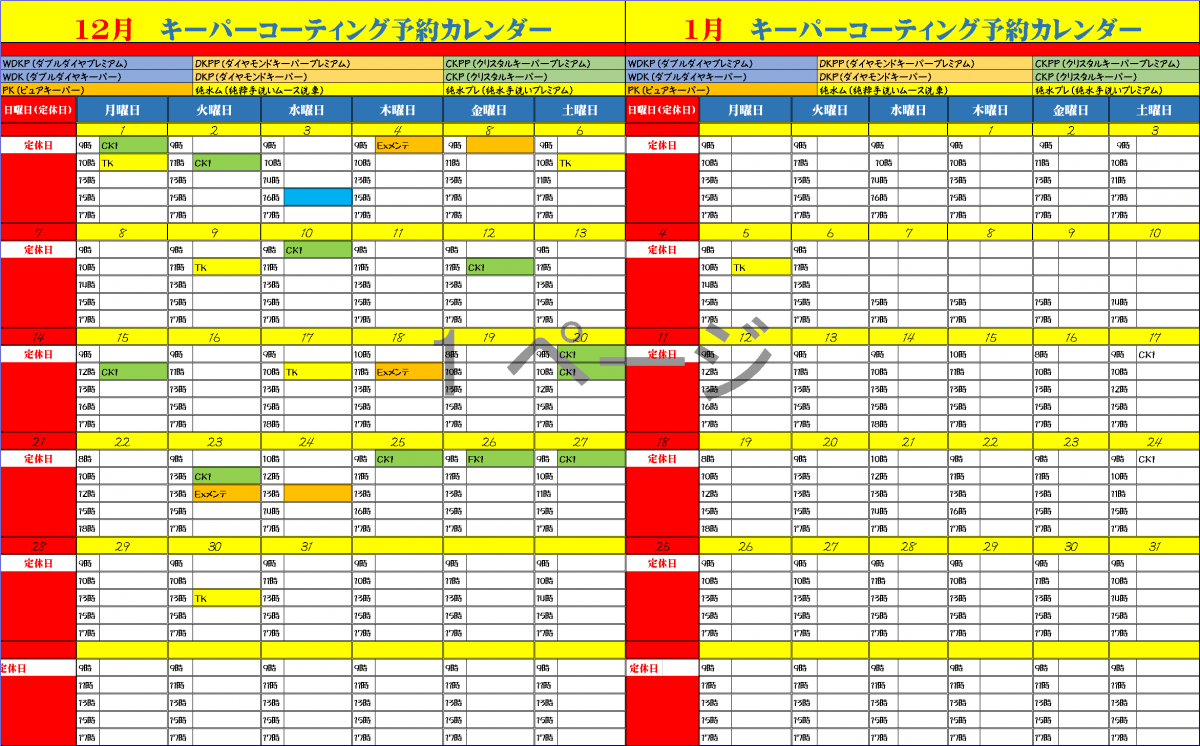 ★令和7年12月.令和8年1月のコーティング、洗車予定表★(12月13日9時00分現在) ・お客様のご都合に合う時間や日にちなど確認できますよ!コーティング、手洗い洗車、予約受付中!!いつでもお電話して下さい♪