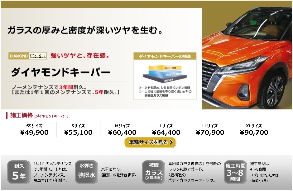 ガラスの層が、ダイヤモンドキーパーの2倍あります。ダイヤモンドキーパーのガラスの膜1枚の厚みは、約1ミクロン(普通のガラスコーティング膜の50倍程度)を越し、塗装面のツヤを損ねている微細傷や凸凹を埋めて被膜表面を厳密に平らにして”異次元のツヤ”を作り出します。また、このガラス被膜は本質的に無機質であり、酸性雨や紫外線に対しての防護能力を持っています。