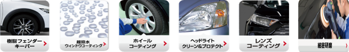 ホイールをブレーキダストや泥汚れから守るホイールコーティング。 雨の日の視界を確保する超撥水ウィンドウコーティング。ヘッドライトの黄ばみ・くすみを取り除き、コーティングするヘッドライト クリーン&プロテクト。下回りの錆を防止するアンダーコートなど各部分をコーティングするメニューをご用意いたしました。コーティング、洗車のスペシャリストだからこそ提供できる品揃えです。