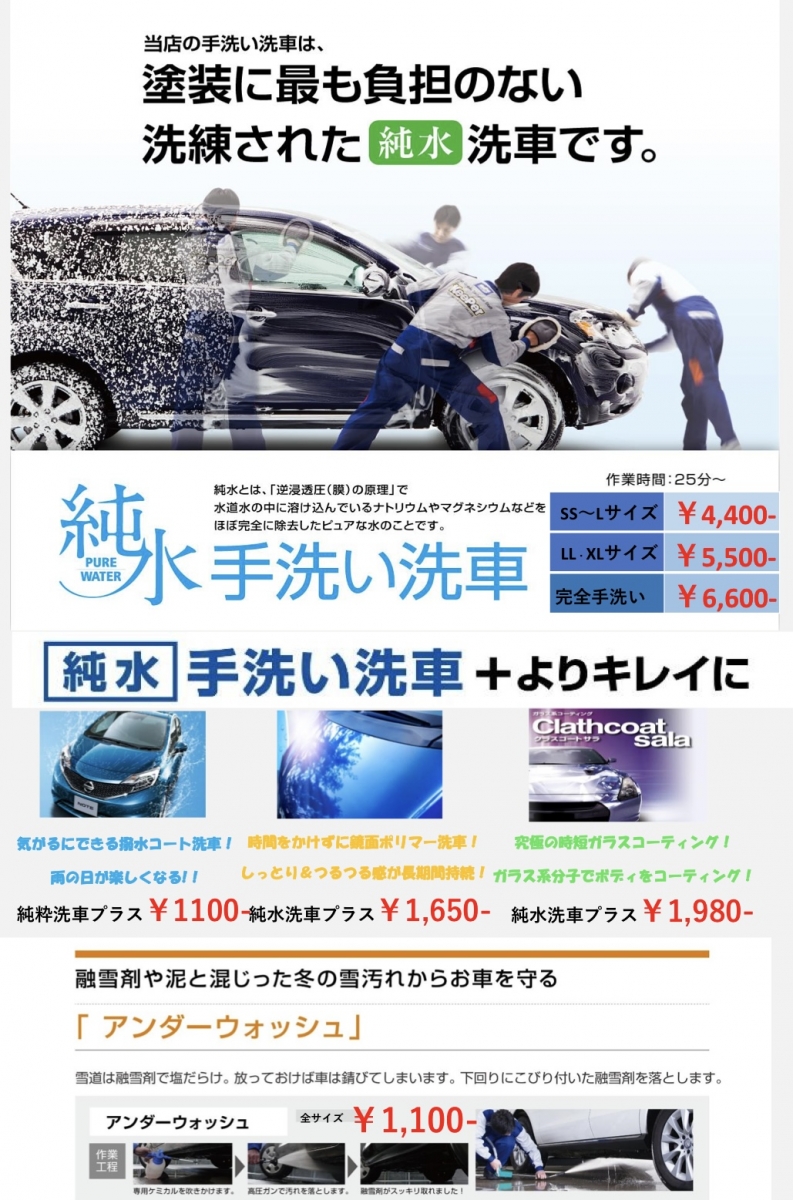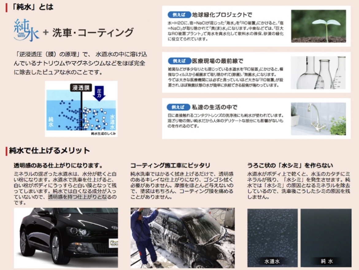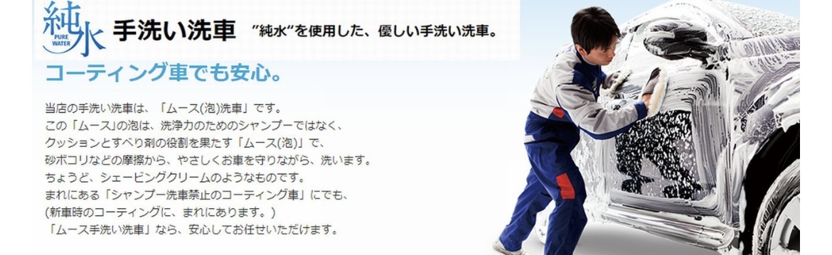 「当店の特別なこだわり」全てのお車に純水手洗い洗車、純水使用コーティング