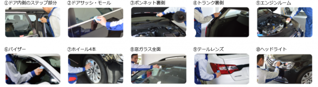 車のボディ以外も、隅々まで美しさを保つ。 ボディをコーティングで守り、ボンネット・トランクの裏・ドアヒンジ・塗装してある隅々までコーティングします。 ①窓ガラス ②アルミホイール4本 ③ヘッドライト ④テールレンズ ⑤サイドバイザー ⑥樹脂フェンダーキーパー ⑦ドア内側のステップ部分 ⑧ボンネットの裏側 ⑨トランクの裏側 ⑩給油口の内側 ⑪エンジンルームの中 ⑫除菌車内清掃