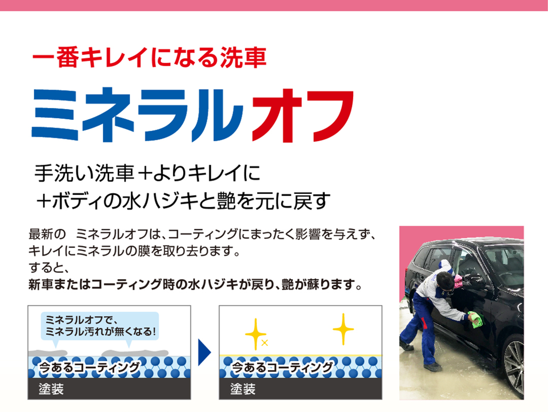 クルマに長く、キレイに乗りたい。でもそんなにお金も、時間もかけられない。洗車をこまめにするのもめんどくさい。そんな女性のクルマへの想いを叶えたコーティングでもない、ワックスでもない。新発想のボディケアメニュー『ミネラルオフ』。約3か月から半年間「ツヤ」と「水はじき」が続くから、洗車回数も減らせて、節約にもなります。