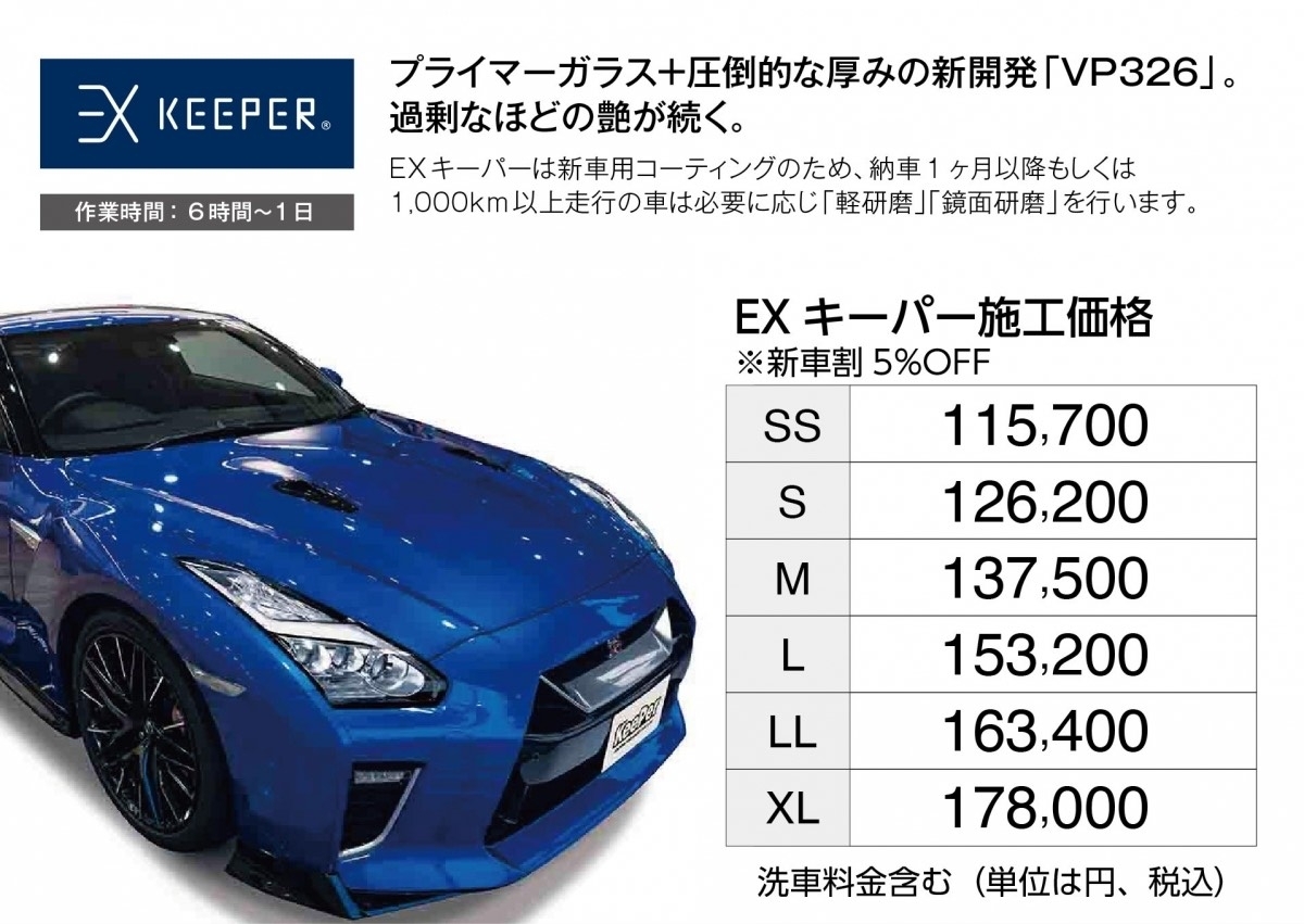 プレミアム仕様において、窓ガラスは5ヶ月耐久、ホイール・ライトレンズ・無塗装樹脂パーツ・サイドバイザー・エンジンルームは1年耐久 、タッチパネルは2年耐久です。