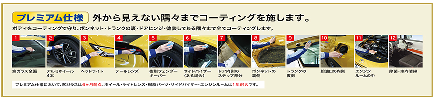 ボディコーティング(ガラス系コーティング・ポリマーコーティング)、窓ガラスコーティング(フッ素ガラスコーティング、シリコンコー ティング)ホイール コーティング、下回り防錆コーティング、エンジンルームコーティング等々コーティングに関することはコーティング技術認定店にお任せください ♪