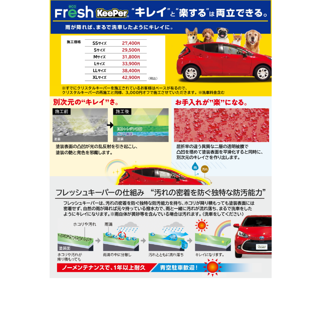 施工後のお手入れは水洗い、シャンプー洗車だけで簡単に汚れが落ちます。