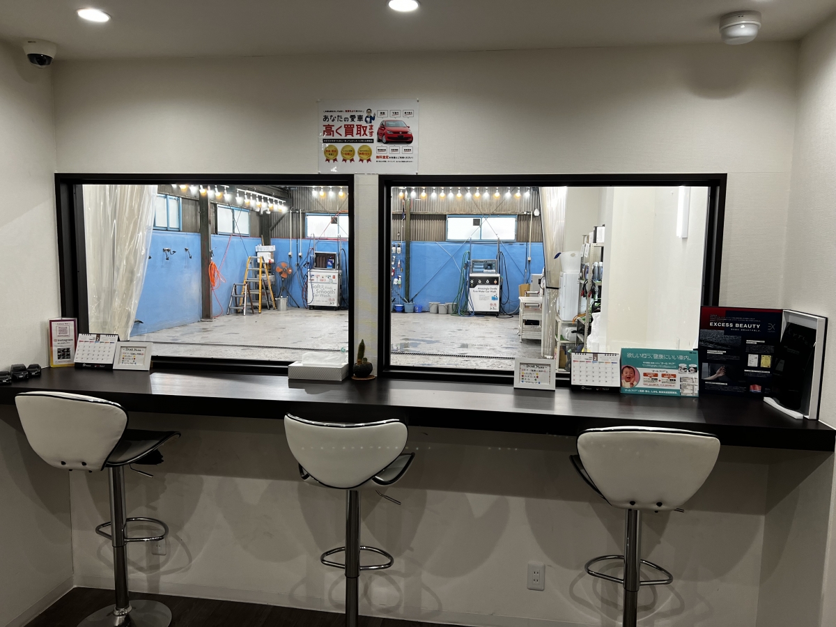 当店は、写真のように作業スペースが見渡せるよう広い窓を設置しておりますので、安心して作業をお任せください。