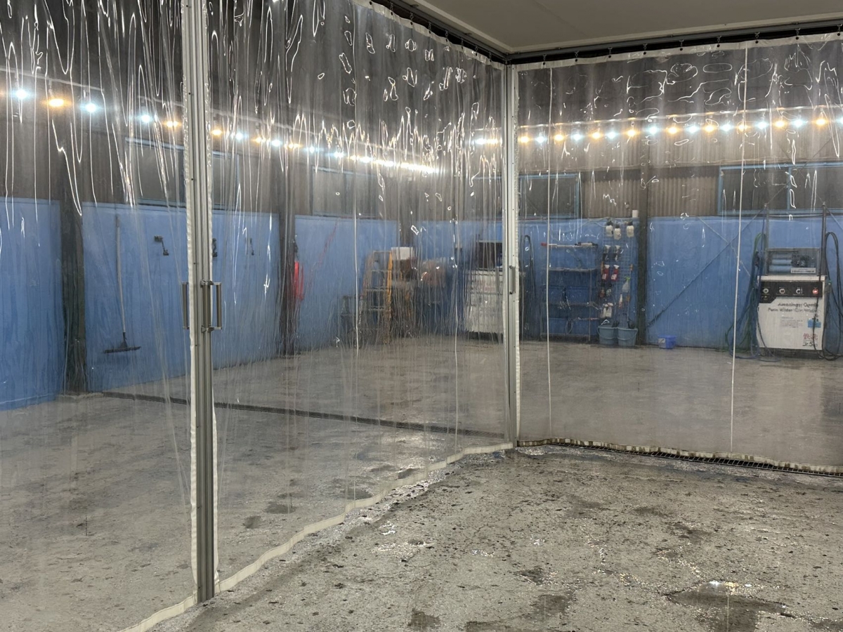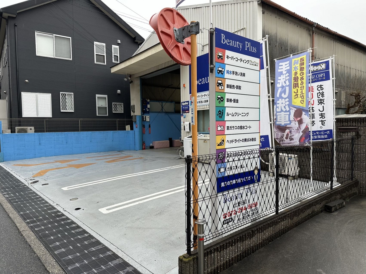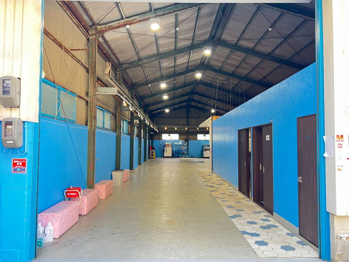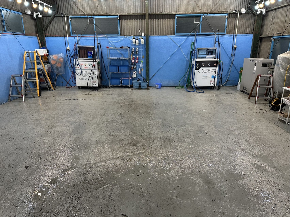 風による砂の影響が少ない、奥まった洗車・施工ブース。