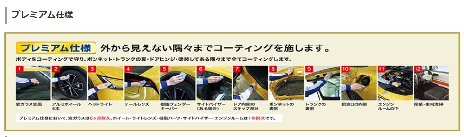 ボディだけではなく愛車に全部コーティングしたい方はプレミアム仕様がオススメです。