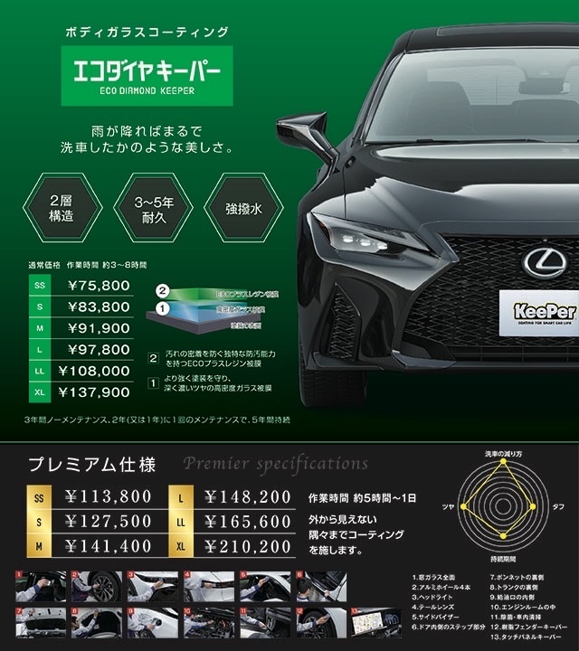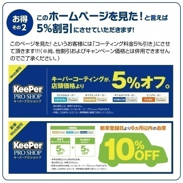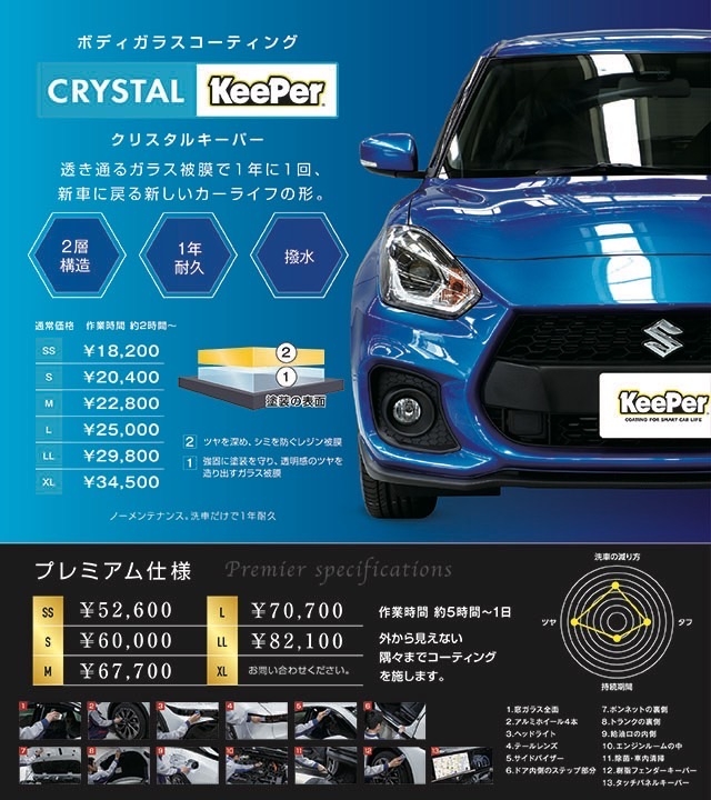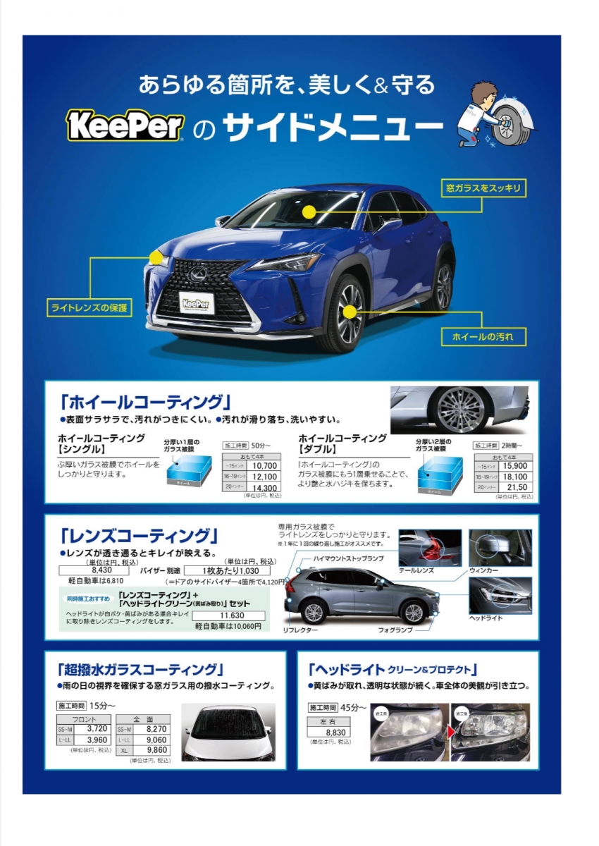 A:ご予約なしでも、当日のご予約でも大歓迎です。ご希望の時間での作業を一度店舗にご相談下さい!電話は下部バナーより※お問い合わせの際は、「キーパーのホームページをみた」とお伝え頂くとスムーズです。