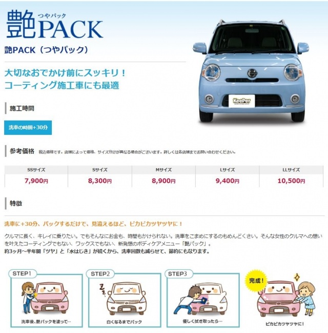 クルマに長く、キレイに乗りたい。でもそんなにお金も、時間もかけられない。洗車をこまめにするのもめんどくさい。そんな女性のクルマへの想いを叶えたコーティングでもない、ワックスでもない、新発想のボディケアメニュー「艶パック」。