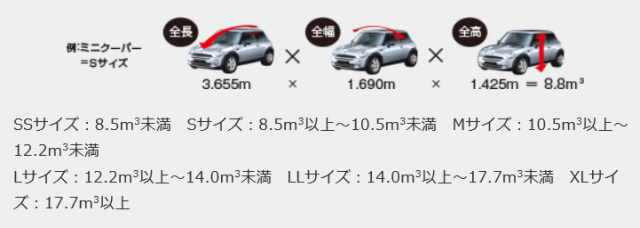 当店では料金を公平に保つ為に『現行型』の体積(全長×全幅×全高)を基準に、形状を考慮したうえで、下記車種分類表に基づきサイズ分けを行っています。旧型式の車も現行型のサイズ分けに準じます。