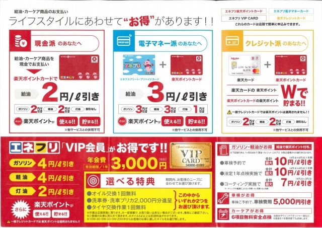 当店では、ガソリン・軽油が店頭価格から割引になる【VIP会員】のご入会が大変オススメになります。 詳細は、上記画像の記載通りとなっております。 当店は、コーティングはもちろん、認証整備工場でもあります。一般整備から、分解整備、車検整備まで 幅広く整備可能となってます。 ※VIP会員、一年ごとの更新が必要になります。別途、更新料¥3300【税込み】