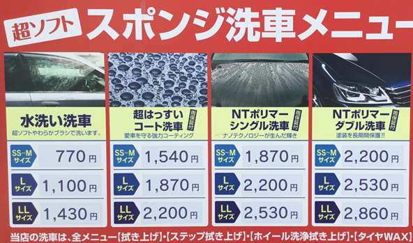 当店の洗車機洗車は全コース「ボディー拭き上げ」、「ホイール拭き上げ」、「タイヤワックス」、「ドアのふち、トランクのふち、ボンネットのふちの拭き上げ」がセットになっています。