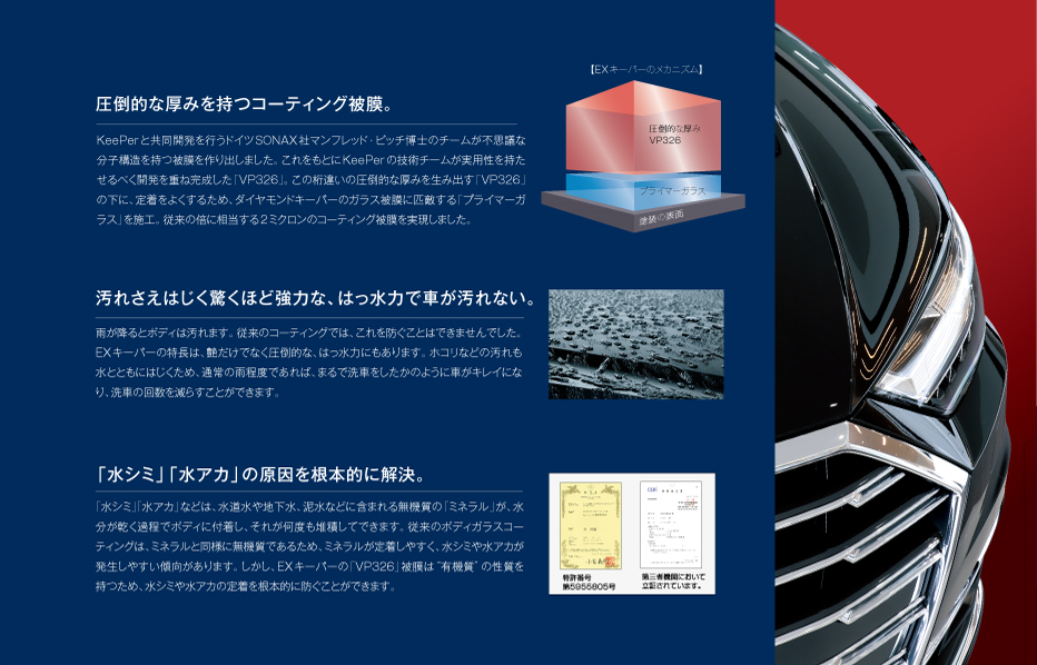 ■クリスタルキーパーの特長 車種、年式(新車・経年車)、色関係無く施工出来ます! 色艶が増し新車並にピカピカになります!新車でも新車以上の艶が! ガラスコーティングの宿命「水シミ(輪ジミ)」が固着しない。(特許公開中)