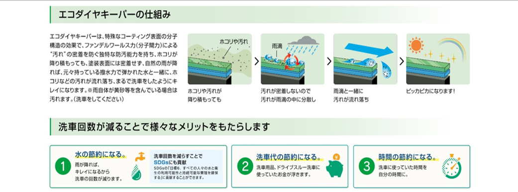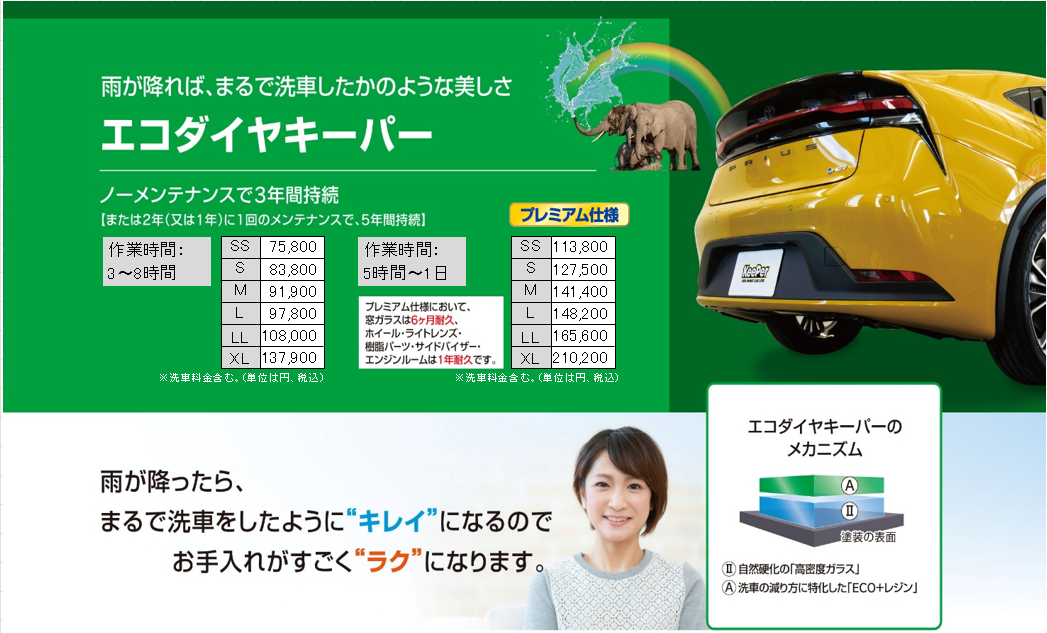 新発想 青空駐車歓迎、雨で車がキレイに!美しさと随一の汚れにくさを兼ね備えたエコダイヤキーパー。 ノーメンテナンス3年耐久 または、1年~2年に1回メンテナンスで5年耐久。