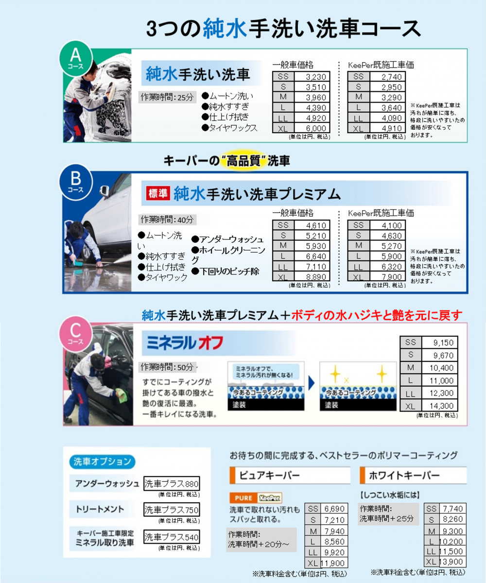 お車の状態毎に適した洗車メニュー取り揃えております。