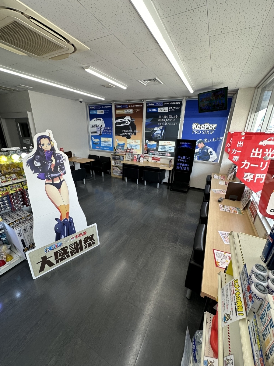 洗車をお待ち頂くゲストルームです。完全分煙で広々とした快適な空間になります。フリーWi-Fiも完備しております。徒歩圏内には飲食店多数と家電量販店等があります。