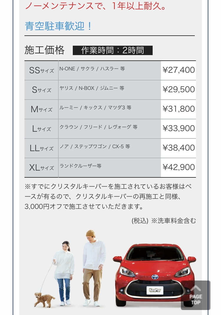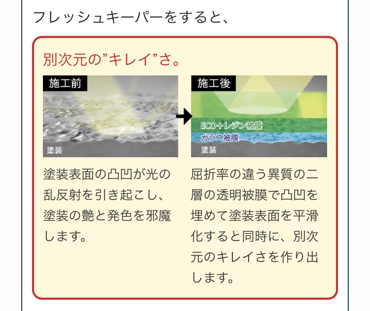 こちらのフレッシュキーパーはノーメンテで一年以上の耐久性を持つコーティングです!クリスタルキーパーの二層目がエコプラスレジン被膜に代わっており、クリスタルキーパーよりさらに自浄性能、水弾き持続力がとて...