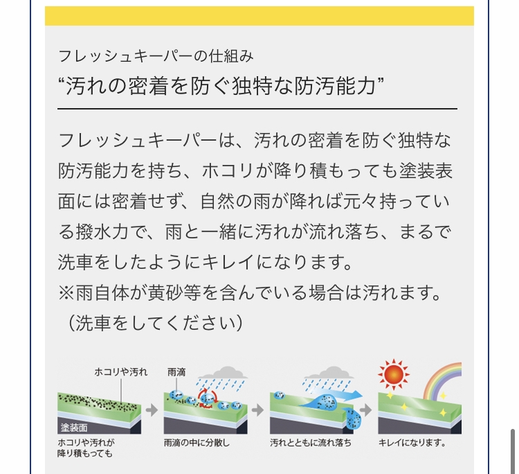 フレッシュキーパーは、汚れの密着を防ぐ独特な防汚能力を持ち、ホコリが降り積もっても塗装表面には密着せず、自然の雨が降れば元々持っている撥水力で、雨と一緒に汚れが流れ落ち、まるで洗車をしたようにキレイになります。
