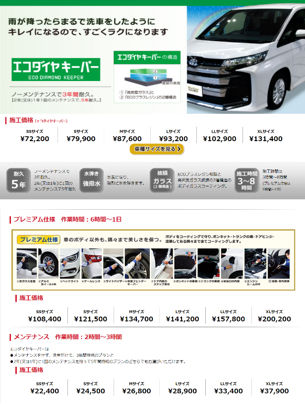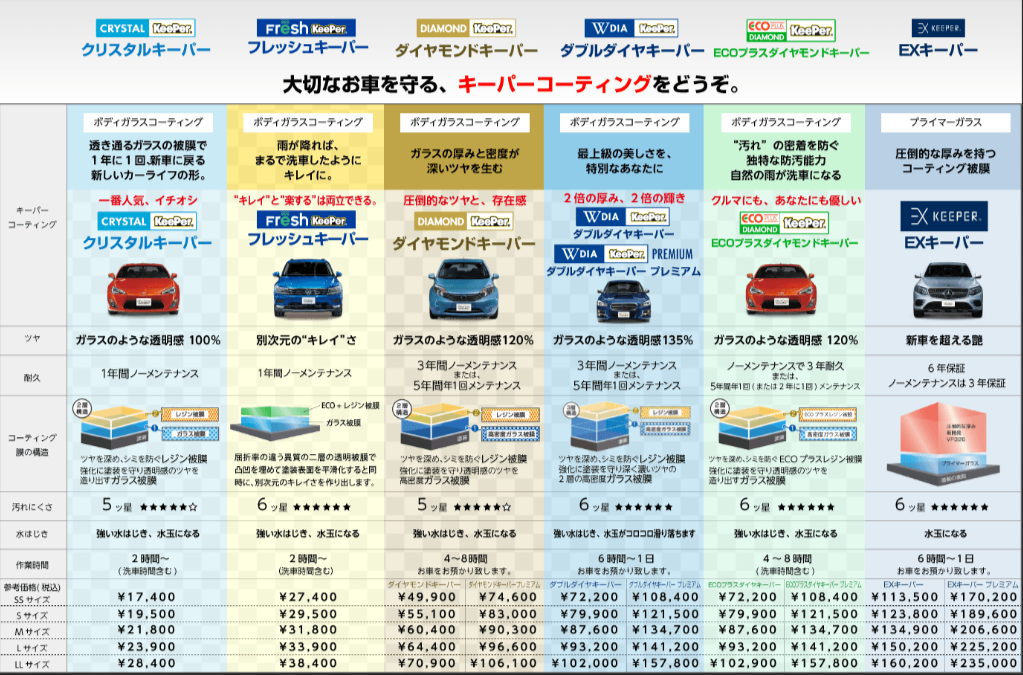 ※クリスタルキーパーは、液体の水の上から塗り、瞬間的に硬化させるので、ガラス被膜の密度はダイヤに比べると比較的低くなります。その厚みも半分程度です。