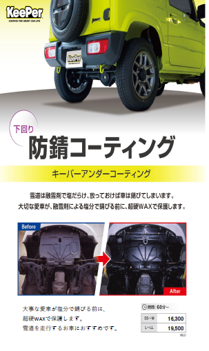 ホイールをブレーキダストや泥汚れから守るホイールコーティング。 雨の日の視界を確保する窓ガラス撥水コーティング。ヘッドライトの黄ばみ・くすみを取り除き、コーティングするヘッドライト クリーン&プロテクト。下回りの錆を防止するアンダーコートなど各部分をコーティングするメニューをご用意いたしました。コーティング、洗車のスペシャリストだからこそ提供できる品揃えです。