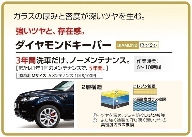 コーティングは、初回の施工だけで効果を維持出来るものではありません。定期的なメンテナンスを繰り返すことにより、効果は半永久的となり、愛車のキレイを維持することができます。