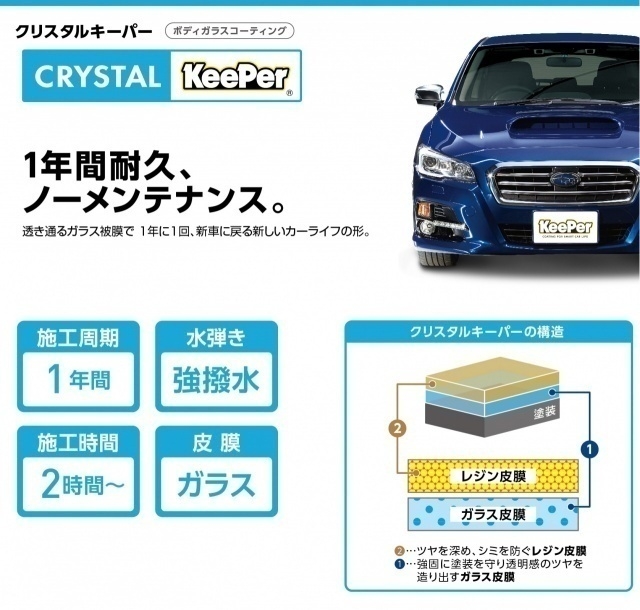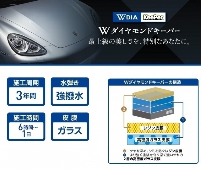 ガラス被膜とレジン被膜の2層構造でお車を守り、ガラス特有の艶が1年間持続し、キレイが続きます。