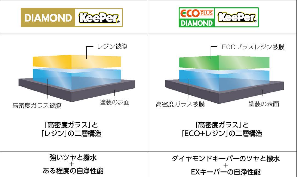 実際担当の私はEXキーパーを施工していますが、目立った汚れは付きにくく洗車回数はダイヤモンドキーパーを施工していたときの半分以下です。 その自浄効果を指数にするとEXキーパーが200、ダイヤモンドキーパーが100、ECO+ダイヤはなんと180! もうほとんどEXキーパーです(笑)