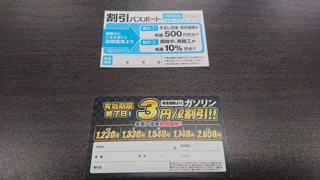 施工日から1年間有効で、いつでも手洗い洗車が500円引きになります。