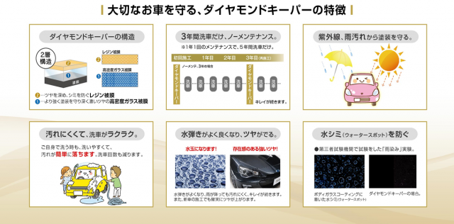 ボディガラスコーティングでは、定番のWダイヤモンドキーパー、ダイヤモンドキーパー、クリスタルキーパーに加え、最新のEXキーパー、ECOダイヤモンドキーパー、フレッシュキーパーをラインナップ。普段のお手入れとして、純水手洗い洗車や車内清掃、オプションとして窓ガラスやアルミホイール、レンズやバイザー、SUVに人気の樹脂フェンダーまで、車のありとあらゆる箇所のコーティングを取り揃えております。もちろん、他店施工のメンテナンスもお任せください。